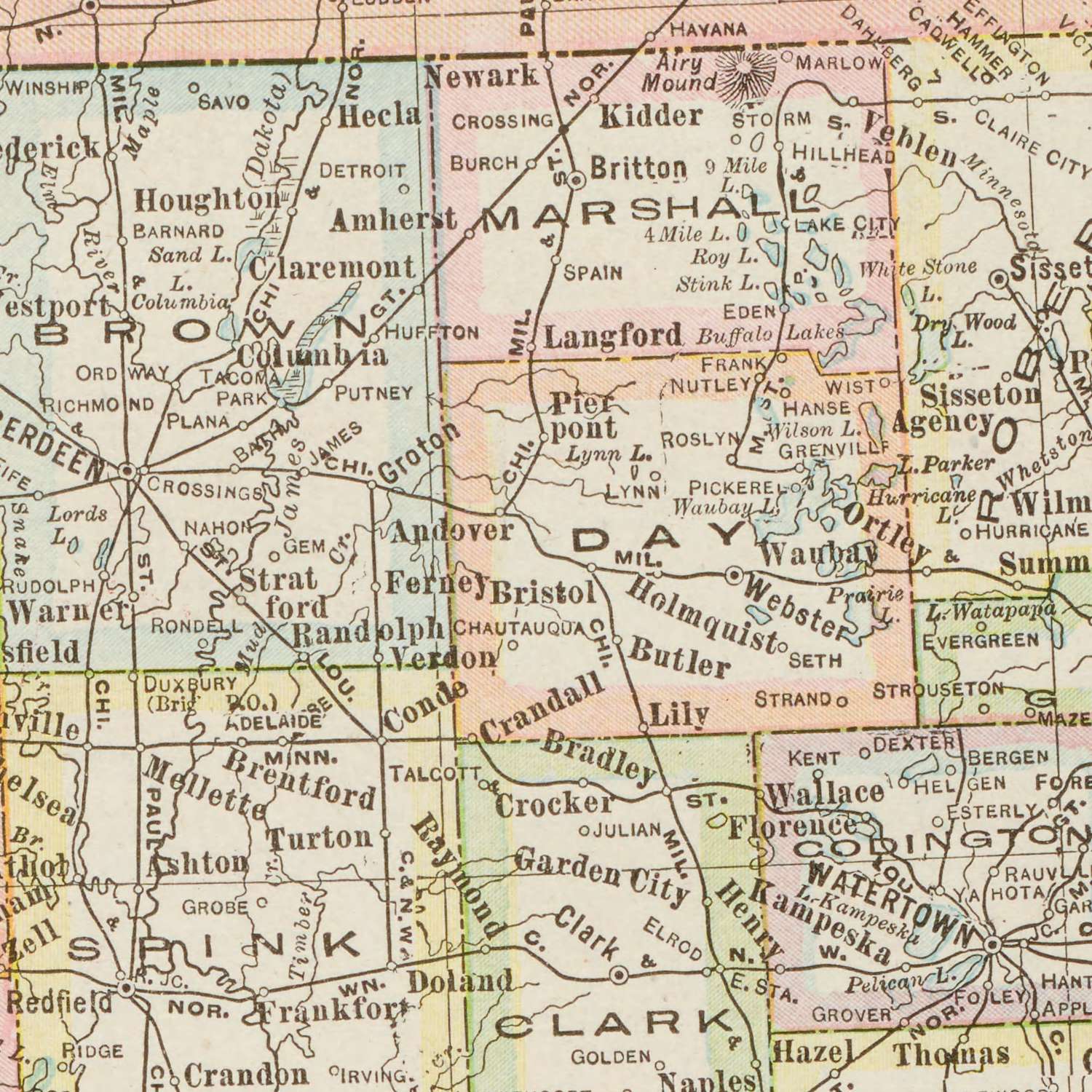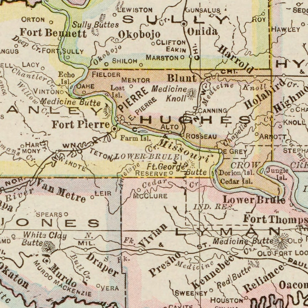 Physical geography is rendered with uncommon tact. Hachures articulate the Black Hills as a compact massif, their slopes feathering into the western plains, while the cutbanks and ravines of the Badlands region register as a lacework of drainage. The Missouri River’s powerful course bisects the state, curving past Pierre and gathering the Cheyenne, White, and Bad Rivers before turning southeast. Eastward, the James and Big Sioux rivers run in broad, gentle valleys amid a constellation of glacial lakes, their shorelines and outlets crisply labeled. Drainage patterns unfurl like botanical veins, reading as both hydrology and history—routes of movement, boundaries of settlement, and determinants of soil and pasture. The effect is a tactile, almost topographic sensibility achieved without contours, a testament to Cram’s mastery of relief by line.