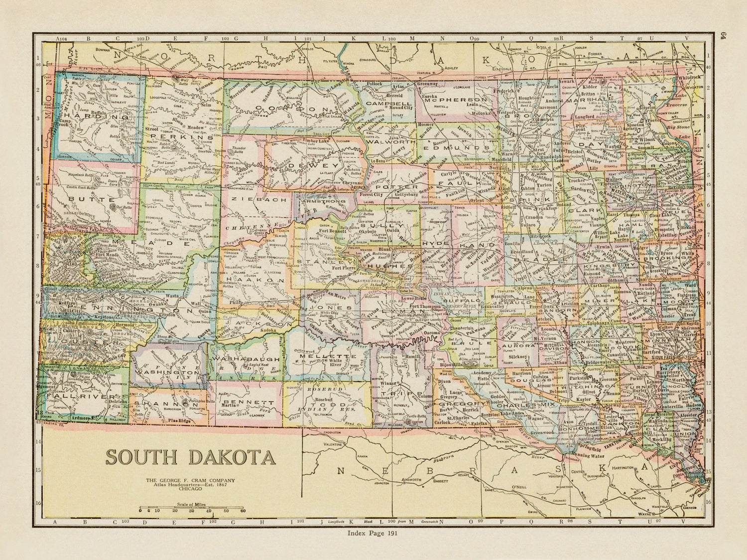 The map’s authority rests on the Cram firm’s long-standing commitment to accuracy and usability. Founded in 1867, the George F. Cram Company built an educational and reference legacy by standardizing symbols, curating reliable data, and refining page design so readers could find what they needed instantly. Here, an alphanumeric grid keys the eye to an index on page 191 of the atlas, transforming place names into coordinates and back again. This disciplined architecture—grid, legend, and scale—anchors the narrative of South Dakota as a knowable, navigable space. It exemplifies Cram’s philosophy: a map should serve student, traveler, and scholar alike, translating the complexity of land and life into legible, verifiable form.