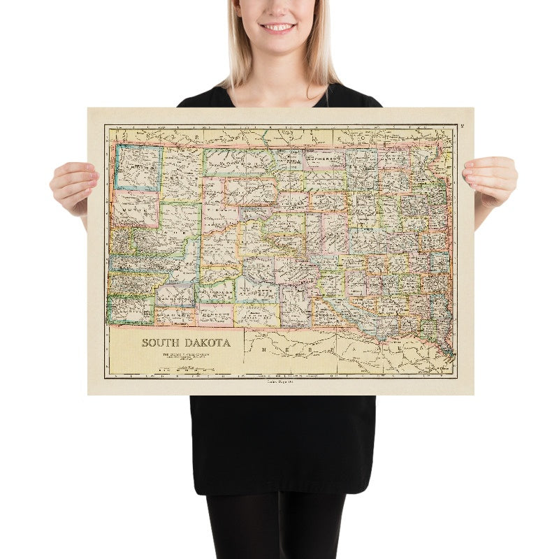 Rare Old Map of South Dakota, 1925: Sioux Falls, Rapid City, Black Hills, Badlands, Missouri River