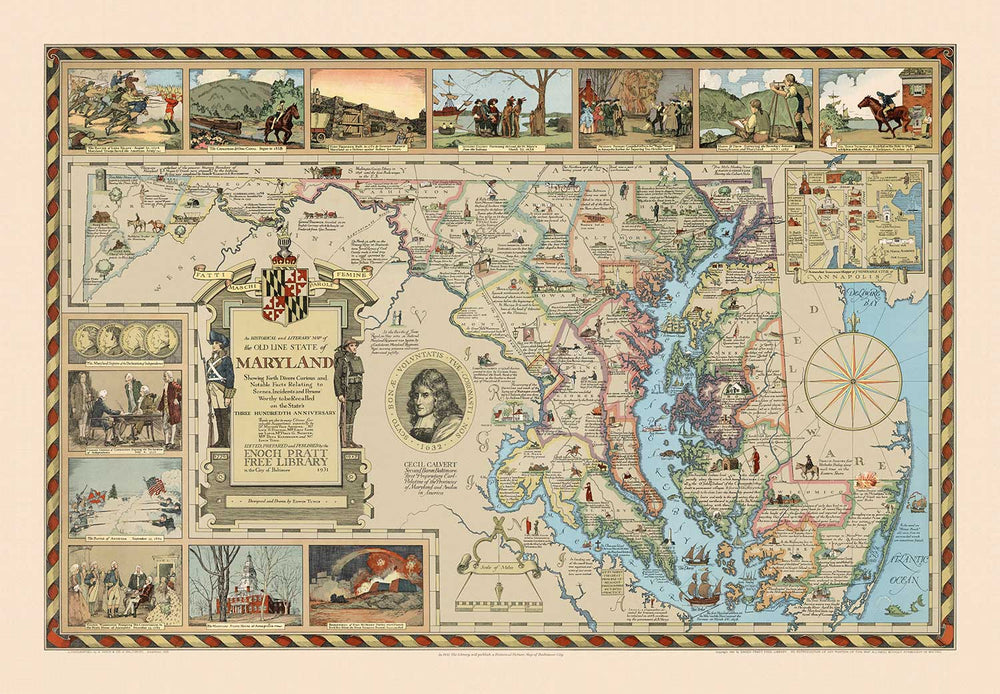 Printed on the state's 300th anniversary, this historical map of the Old Line State illustrates the vast history of that state, including its notable facts, scenes, people, and incidents.