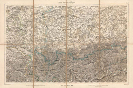 The "Atlas der Alpenländer. Blatt II." is a masterful creation by the esteemed cartographer Johann Mayr, crafted in 1874. This exquisite map, a part of an eleven-sheet topographic atlas, captures the intricate geographical and political tapestry of the Alpine regions. Mayr’s dedication to precision and detail is evident in this sheet, which encompasses Switzerland, Southern Bavaria and Ulm in Germany, and Northern Tyrol and Innsbruck in Austria. The map is a testament to Mayr’s expertise, illustrating the landscape with meticulous hachures that bring the mountainous terrain to life.