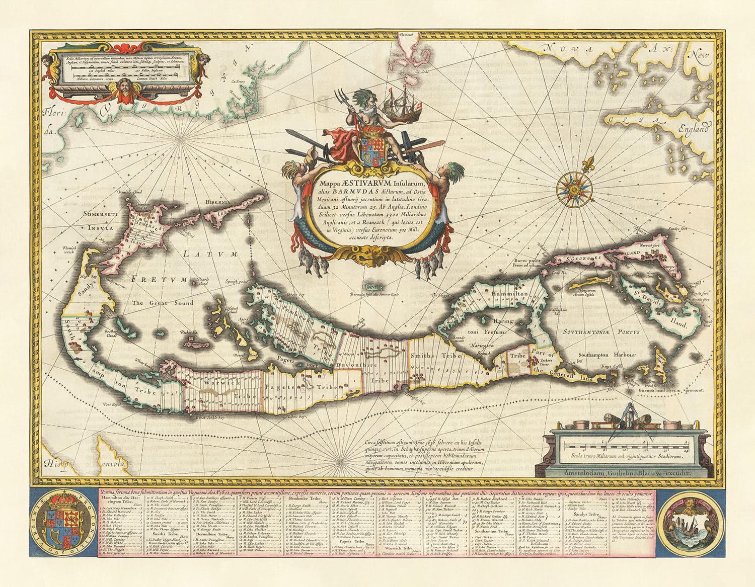 Old Map of Bermuda, 1640 by Willem Blaeu: Somers Isles Tribes & Parishes
