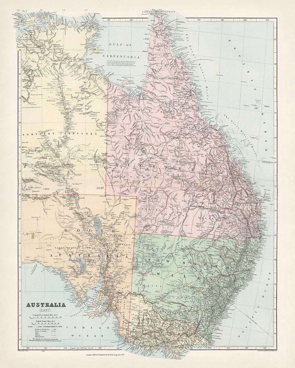 Step into the past with the exquisite "Australia (East)" map, a masterful creation by Edward Stanford, a renowned figure in the world of cartography. This map, originally issued in 1887 and updated in 1904, captures the vibrant tapestry of Eastern Australia during a time of significant colonial development. Stanford, who acquired the plates from John Arrowsmith's prestigious London Atlas, was known for his meticulous attention to detail and high-quality craftsmanship. His work is a testament to the era's cartographic advancements, offering a window into the historical and geographical nuances of the time.