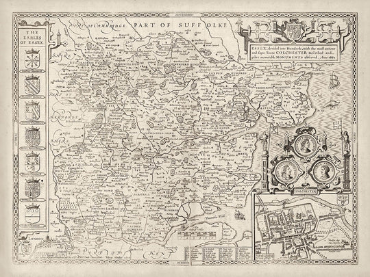Many of the towns, villages and cities in Essex are already visible in this ancient map, such as Colchester, Chelmsford and Braintree. There's a detailed engraving of Colchester in the bottom right (the capital of the county) and some coats of arms on the left side of the map.