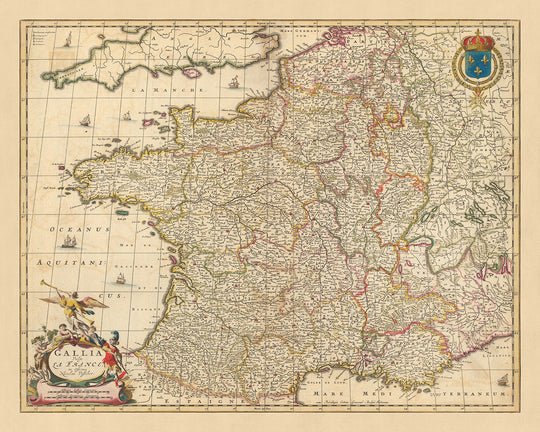 This 'Gallia Vulgo La France' map by Nicolaes Visscher II offers a fascinating journey through the landscapes, cities, and political divisions of 17th century France. Whether you're a history buff, a cartography enthusiast, or simply someone who appreciates fine artistry, this map is sure to be a captivating addition to your collection.