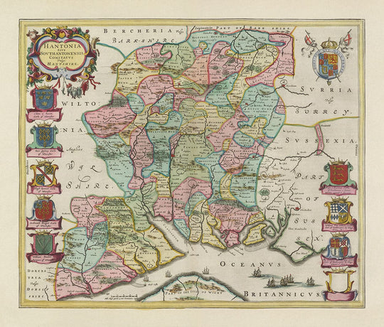 This is an exceedingly rare, old full colour map of Hampshire created by master mapmaker Joan Blaeu from his workshop in Amsterdam and originally published in this Theatrum Orbis Terrarum Sive Atlas Novus in 1665.
