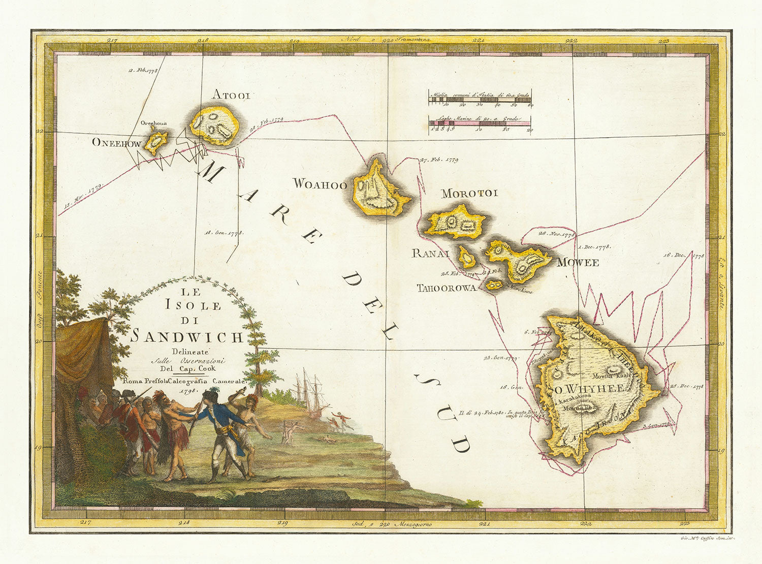 This map depicts Captain Cook's 'discovery' of Hawaii. Though Cassini had never been to Hawaii, he used Captain Cook's Chart to model the map.
