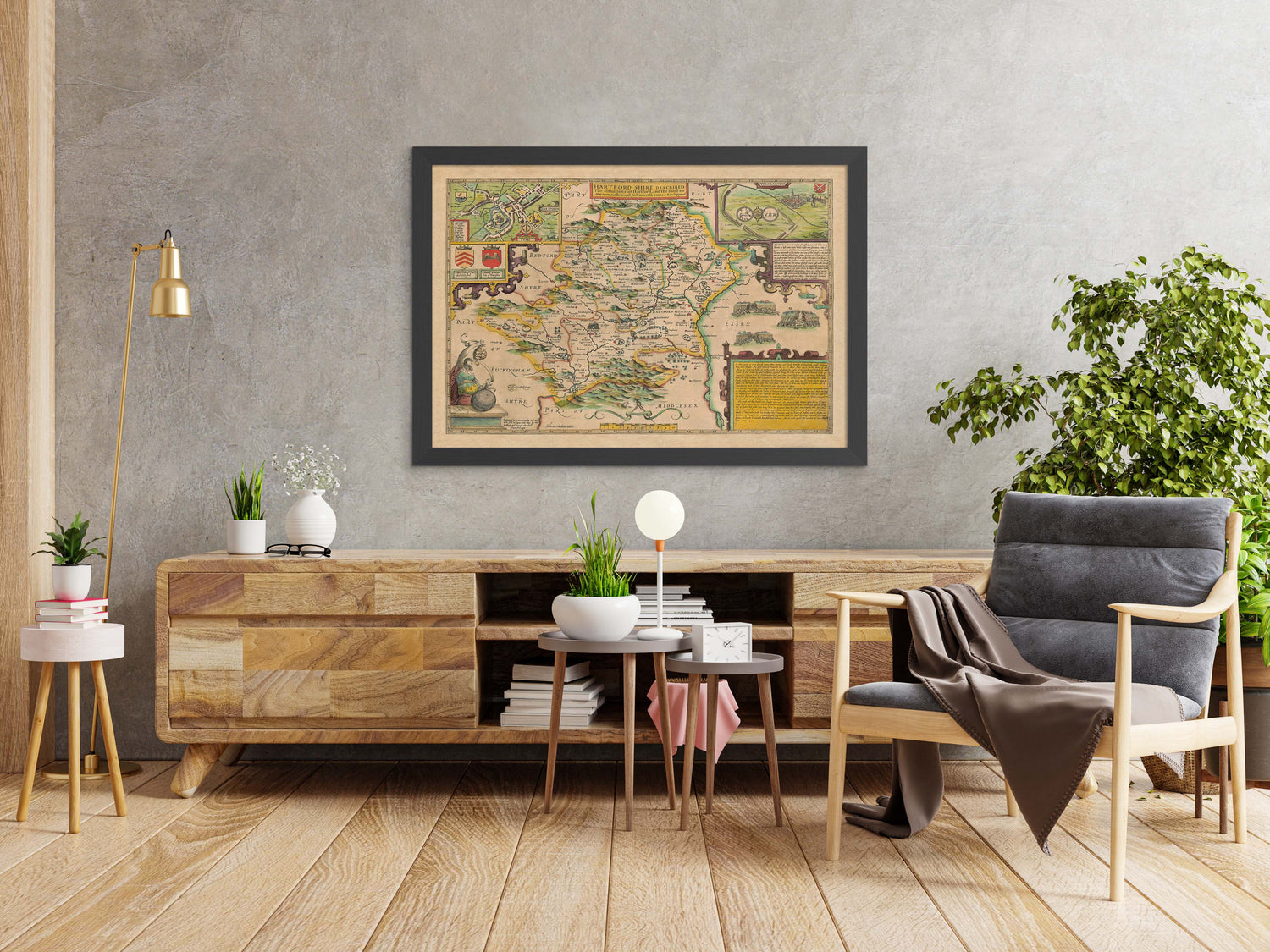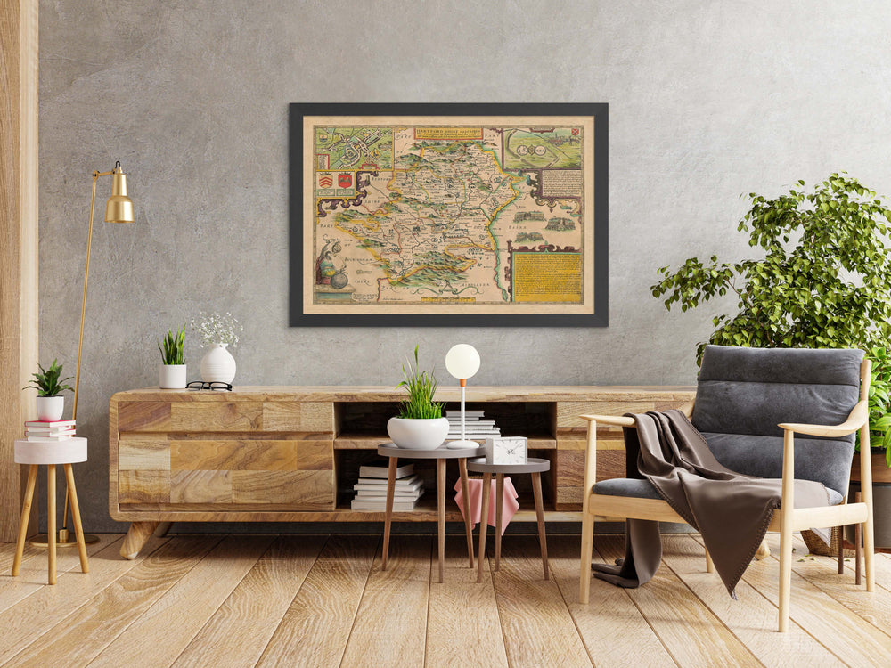 Many of the towns, villages and cities in Hertfordshire are already visible in this ancient map, such as Hertford, Watford and St Albans. Curiously, there's a detailed engraving of Verulamium in the top right - an ancient Roman city that was situated under southwest St Albans.