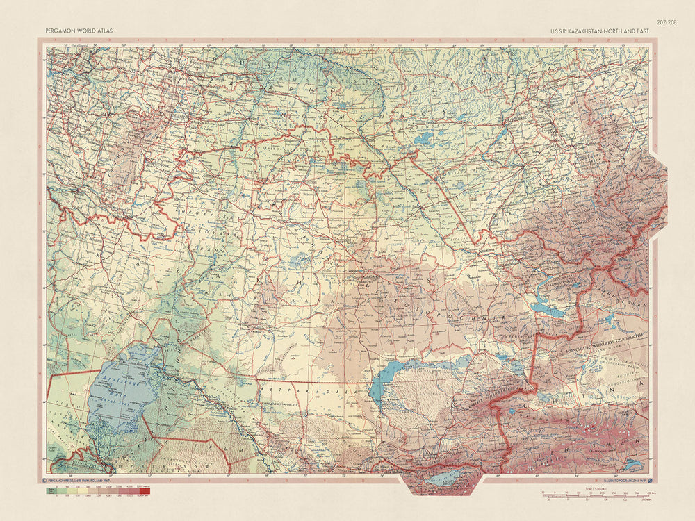 This 1967 map of the northern and eastern regions of the USSR in Kazakhstan, published by the Polish Army Topography Service, is a detailed political and physical map that provides a comprehensive overview of the region's geography and political landscape. The map covers almost all of modern-day Kazakhstan, excluding only the westernmost parts of the country.