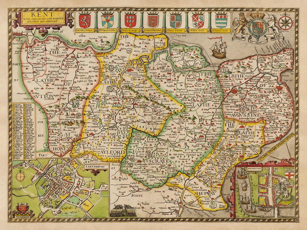 Many of the towns, villages and cities in Kent are already visible in this map. In the bottom left is a detailed engraving of Canterbury, along with a legend and more than 50 points of interest. In the bottom right there's a cute inset engraving of Rochester and the river Medway.