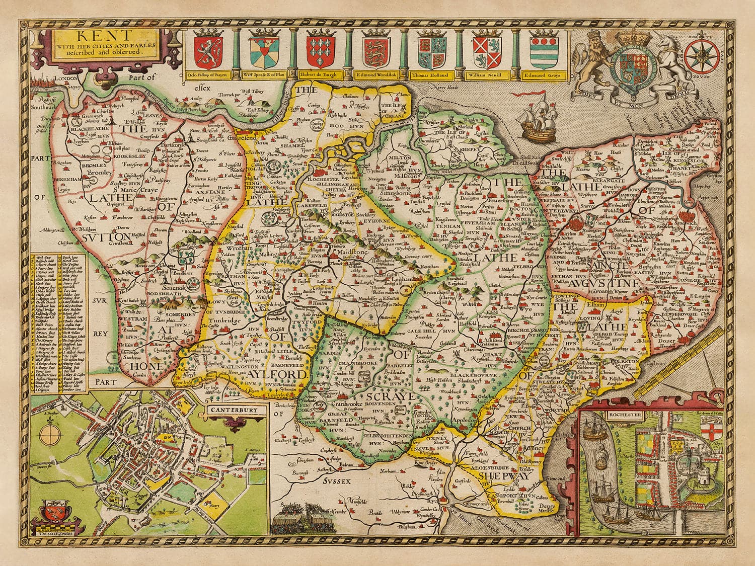 This old, full colour and exceedingly rare map shows the ancient county of Kent as it was in 1611. It was created by John Speed and engraved by Jodocus Hondius, and originally published in Speed's "The Theatre of the Empire of Great Britaine".