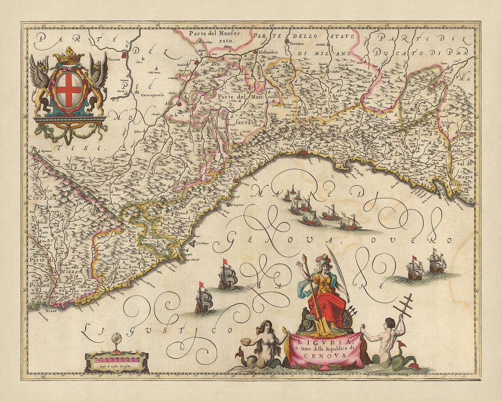 Old Map of Liguria & Republic of Genoa by Visscher, 1690: La Spezia, Nice, Turin, Sanremo, Maritime Alps Natural Park