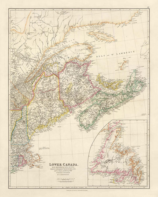 Immerse yourself in the rich tapestry of history with the map titled "Lower Canada, New Brunswick, Nova Scotia, Prince Edward Island, Newfoundland, and parts of the United States," crafted by the esteemed cartographer John Arrowsmith in 1844. This map is a testament to Arrowsmith's unparalleled skill and precision, capturing the intricate political and physical landscapes of the time. His work is celebrated for its clarity and elegance, marking a significant evolution in the art of cartography. With its distinct outline color, this map stands as a beacon of modernity in the 19th century, offering a window into the past with both beauty and accuracy.