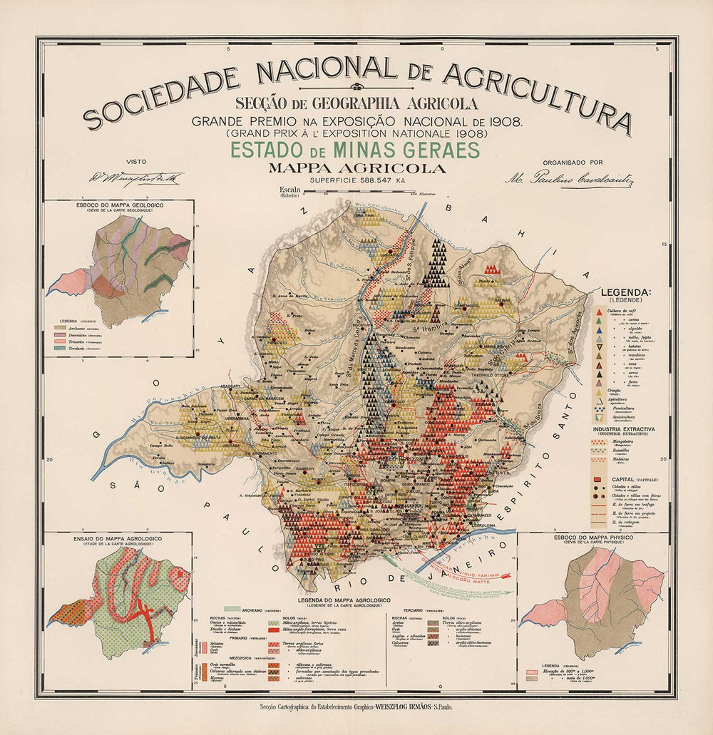 Old Map of Minas Gerais, Brazil in 1908: Agriculture, Geology, Rocks, Soil
