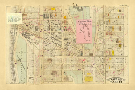 "Part of Ward 12, New York City," an exquisite map crafted by the esteemed G.W. Bromley in 1879, offers a fascinating glimpse into the urban fabric of late 19th-century New York. This meticulously detailed city street map captures the essence of a rapidly evolving metropolis, showcasing the intricate layout of streets, lots, and buildings that defined Ward 12. The map's hand-drawn elegance and color-coded sections provide a vivid portrayal of the residential, commercial, and institutional areas, making it a captivating artifact for historians and urban enthusiasts alike.