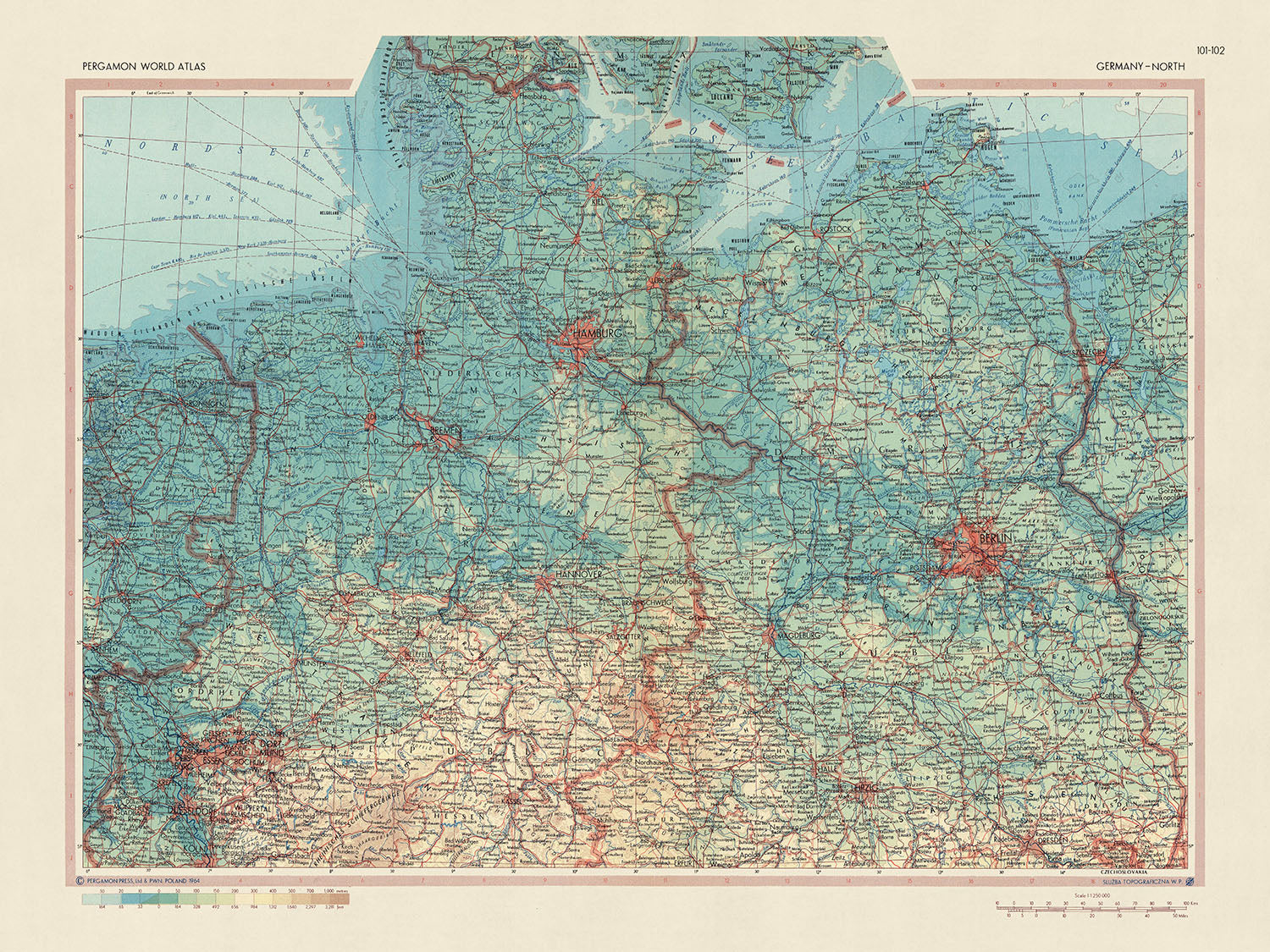 Our luxury e-commerce shop proudly presents the 'Germany - North' map, a distinguished piece of cartographic artistry originally published in 1967 by the Polish Army Topography Service. This map is a compelling blend of political and physical detailing, offering a comprehensive perspective of the northern part of Germany. The map's meticulous attention to detail makes it an interesting country map, as it covers all of northern Germany, including the states of North Rhine-Westphalia, Schleswig-Holstein, Bremen, Hamburg, Lower Saxony, Saxony-Anhalt, Brandenburg, Berlin, Mecklenburg-Vorpommern. The inclusion of these states provides a holistic view of the region, making it a remarkable representation of the country's northern part.