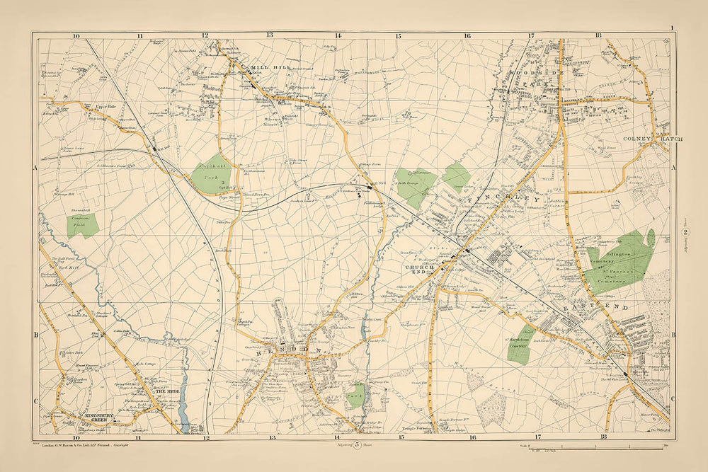 Step into the vibrant history of London with Sheet 1 from Bacon's New Large Scale Atlas of London and Suburbs, a captivating city map crafted in 1900 by the renowned G.W. Bacon & Co. This map offers a window into the dynamic transformation of Northwest London at the dawn of the 20th century. As Victorian landmarks and terraced housing began to dominate the landscape, much of the area remained open farmland, poised for the urban expansion that would define the coming decades. This balance of urban and rural elements makes the map a fascinating artifact of London's evolving cityscape.