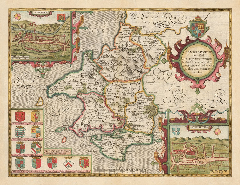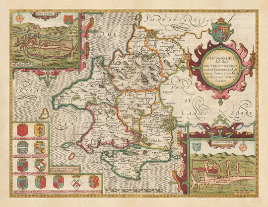 This old, full colour and exceedingly rare map shows the ancient county of Pembrokeshire, Wales in 1611. It was created by John Speed and engraved by Jodocus Hondius, and originally published in Speed's "The Theatre of the Empire of Great Britaine".