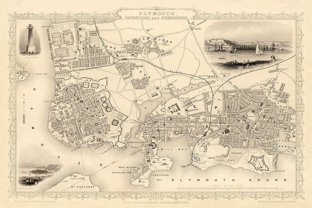 Old Monochrome Map of Plymouth in 1851 by Tallis, Rapkin: Stonehouse, Devonport
