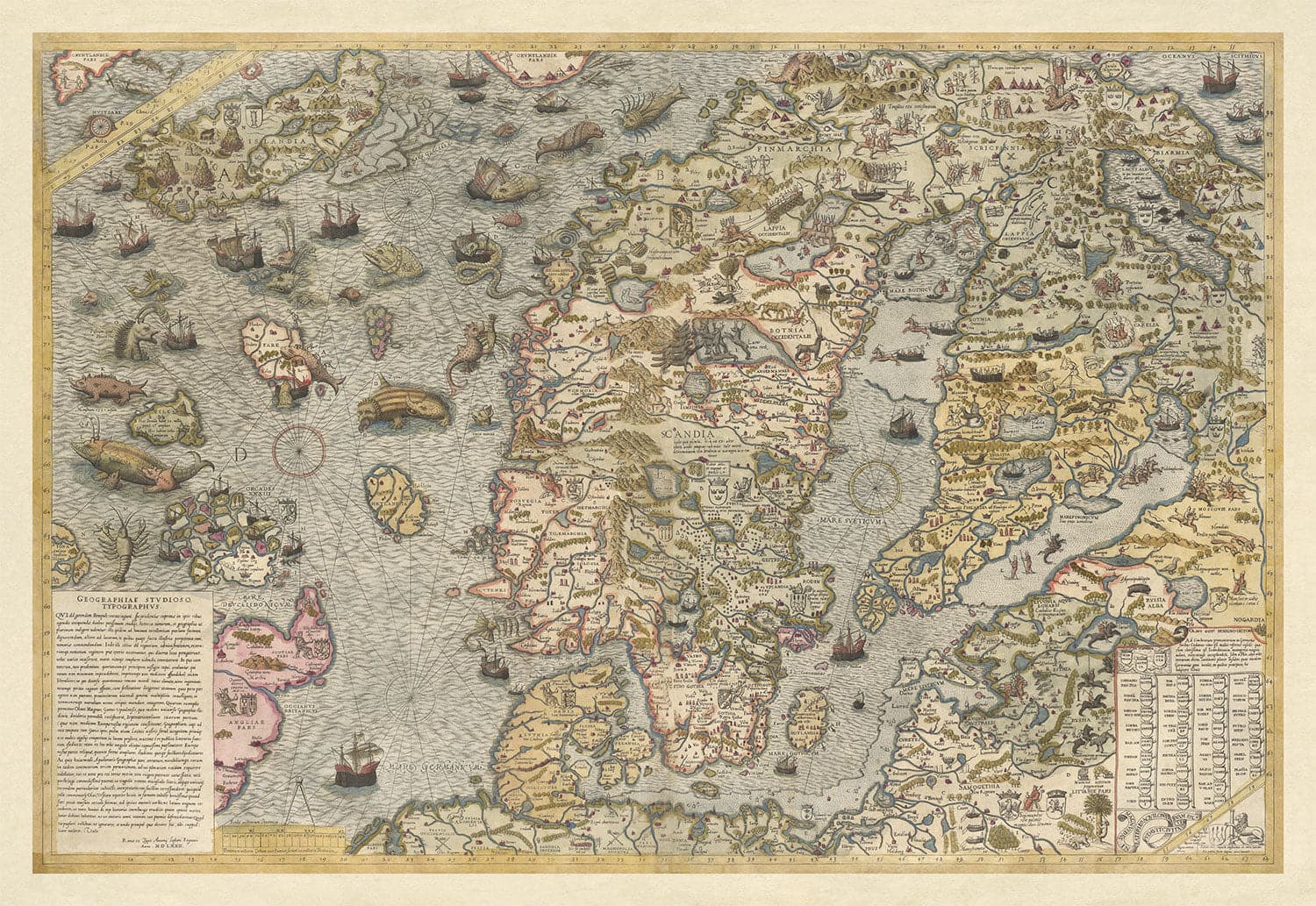 This map is notable for all of the sea creatures (and monsters), figures and other odd characters doing interesting things around the map. Take a look at some of the close-up images and try to spot the two-headed demon pig... thing. This map also includes parts of Scotland and Orkney, the Faroe Islands, Iceland, Germany, Poland and Russia (nowadays parts of Lithuania, Latvia and Estonia).