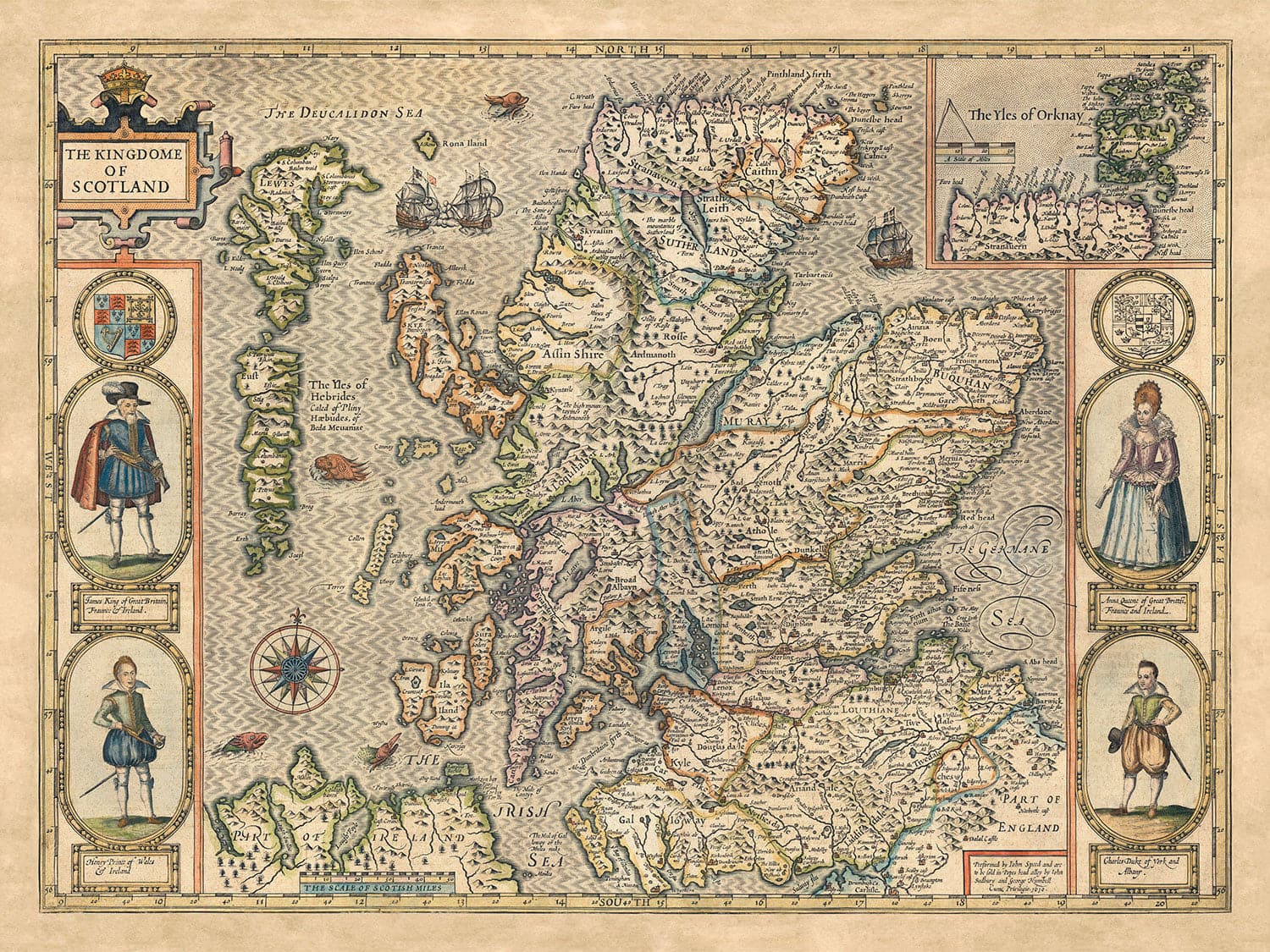 Many of the towns, villages and cities in Scotland are already visible in this map. In the top right there is an inset engraving of the Orkney Islands. Inset are engravings of various royals, such as King James of Great Britain, France and Ireland, Queen Anne and Prince Henry. A later version of the map would see the royals replaced by commoners. The Shetland Isles, Hebrides, Skye, Loch Ness, Loch Lomond, Mull of Kintyre... they're all here.