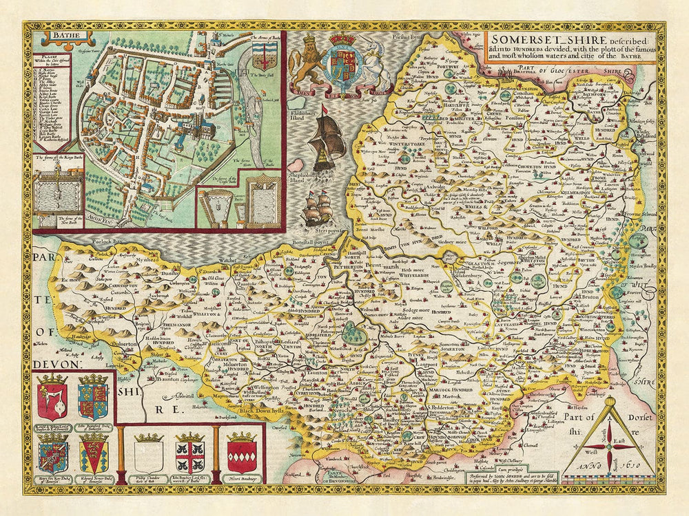 Many of the towns, villages and cities in Somerset are already visible in this map. In the top right corner is a detailed engraving of Bath, then (and still) the capital of this ancient county.