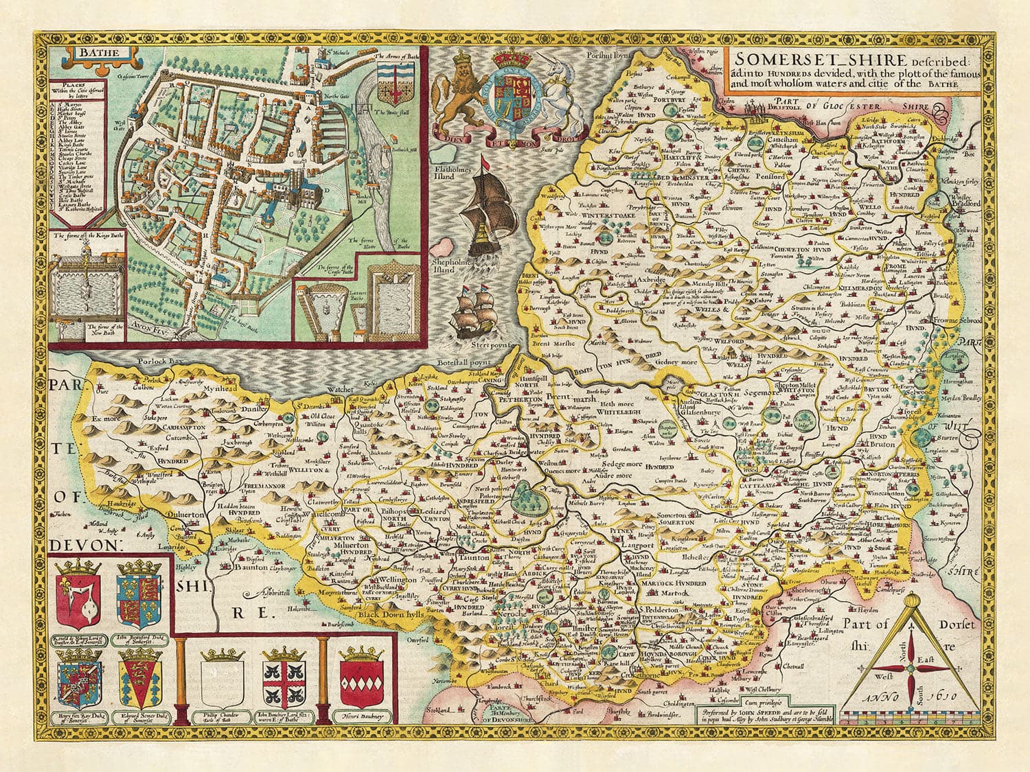 This old, full colour and exceedingly rare map shows the ancient county of Somerset (or Somersetshire as it was known then) as it was in 1611. It was created by John Speed and engraved by Jodocus Hondius, and originally published in Speed's "The Theatre of the Empire of Great Britaine".