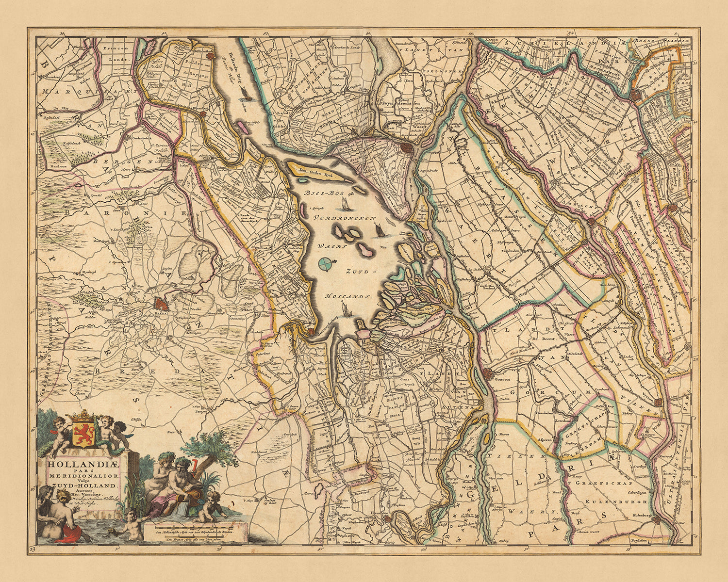 Old Map of South Holland by Visscher, 1690: Dordrecht, Breda, Roosendaal, Gouda, De Biesbosch National Park