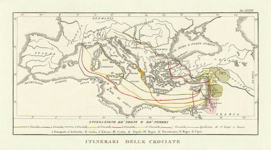 Step into the rich tapestry of medieval history with the "Itinerari delle Crociate," a captivating map crafted by the esteemed Italian geographer Francesco Marmocchi in 1838. This exquisite piece offers a window into the tumultuous era of the Crusades, charting the paths of Christian forces as they embarked on their sacred quests to reclaim Jerusalem. Each route is meticulously traced, revealing the strategic overland and maritime journeys that defined this epoch. The map's intricate detailing of the kingdoms and regions of the Middle East provides a fascinating glimpse into the geopolitical landscape of the time.