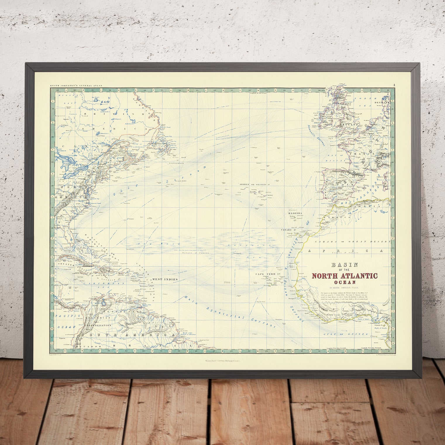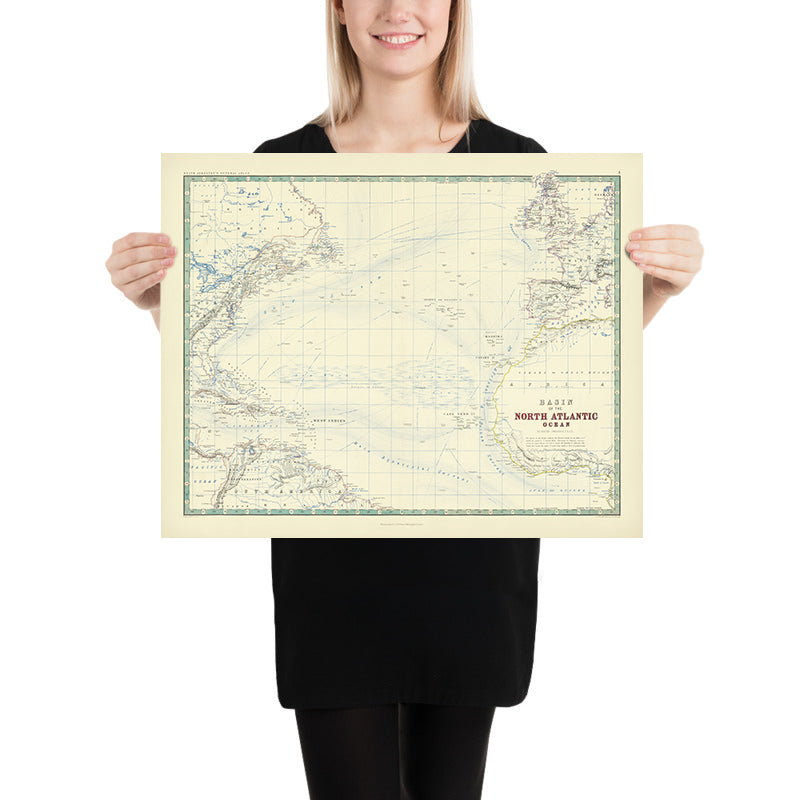 Basin of the North Atlantic, issued in 1861 by W. & A.K. Johnston, captures the oceanic heart of the nineteenth-century world with a scholar’s precision and an artist’s poise. The esteemed Johnston firm—renowned for elevating atlases into objects of enduring reference—organizes the vast theater between North America, Europe, and Northern Africa into a legible, luminous whole. Pastel washes gently differentiate lands and waters while preserving a wealth of fine detail, from coastal intricacies to the careful placement of cities and settlements. A distinctive Piano Key border frames the composition, underscoring the period’s taste for ornamented clarity and lending the chart a refined cadence that complements its deeply informative purpose.