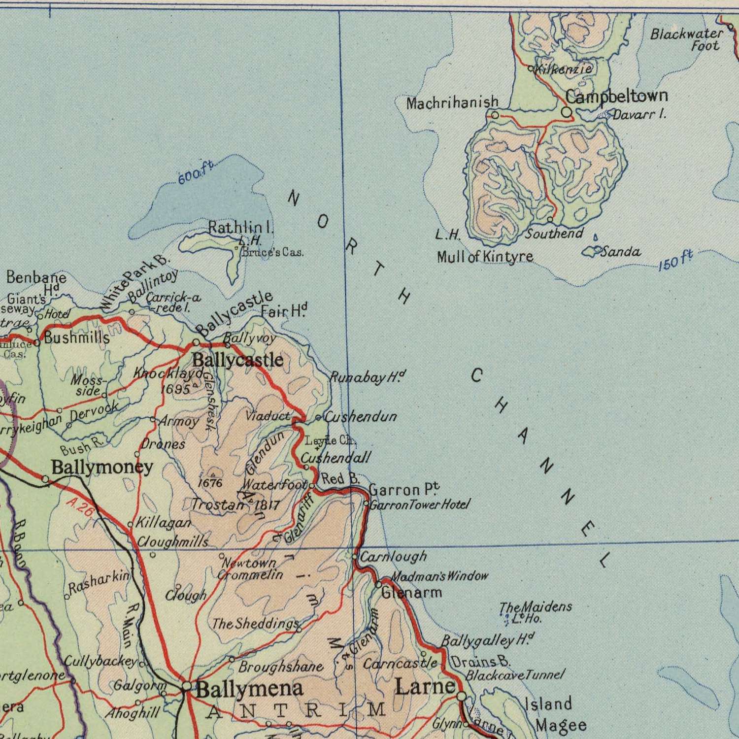 Mid-century Ireland’s political contours are presented with discretion and authority. The line dividing Northern Ireland from the Republic is crisply drawn yet integrated within the broader provincial framework of Ulster, Connacht, Leinster, and Munster, avoiding visual stridency while retaining absolute clarity. Cities and county towns—Dublin’s capital primacy, Cork’s mercantile heft, Limerick’s estuarial command, Galway’s Atlantic gateway—are woven together by an intricate hierarchy of trunk and secondary roads that predates the motorway age, illuminating historic corridors of trade and travel. Ports and river mouths are placed with navigational precision, while county and parish names settle into the landscape with Bartholomew’s famously disciplined typography, making dense information feel effortlessly navigable.