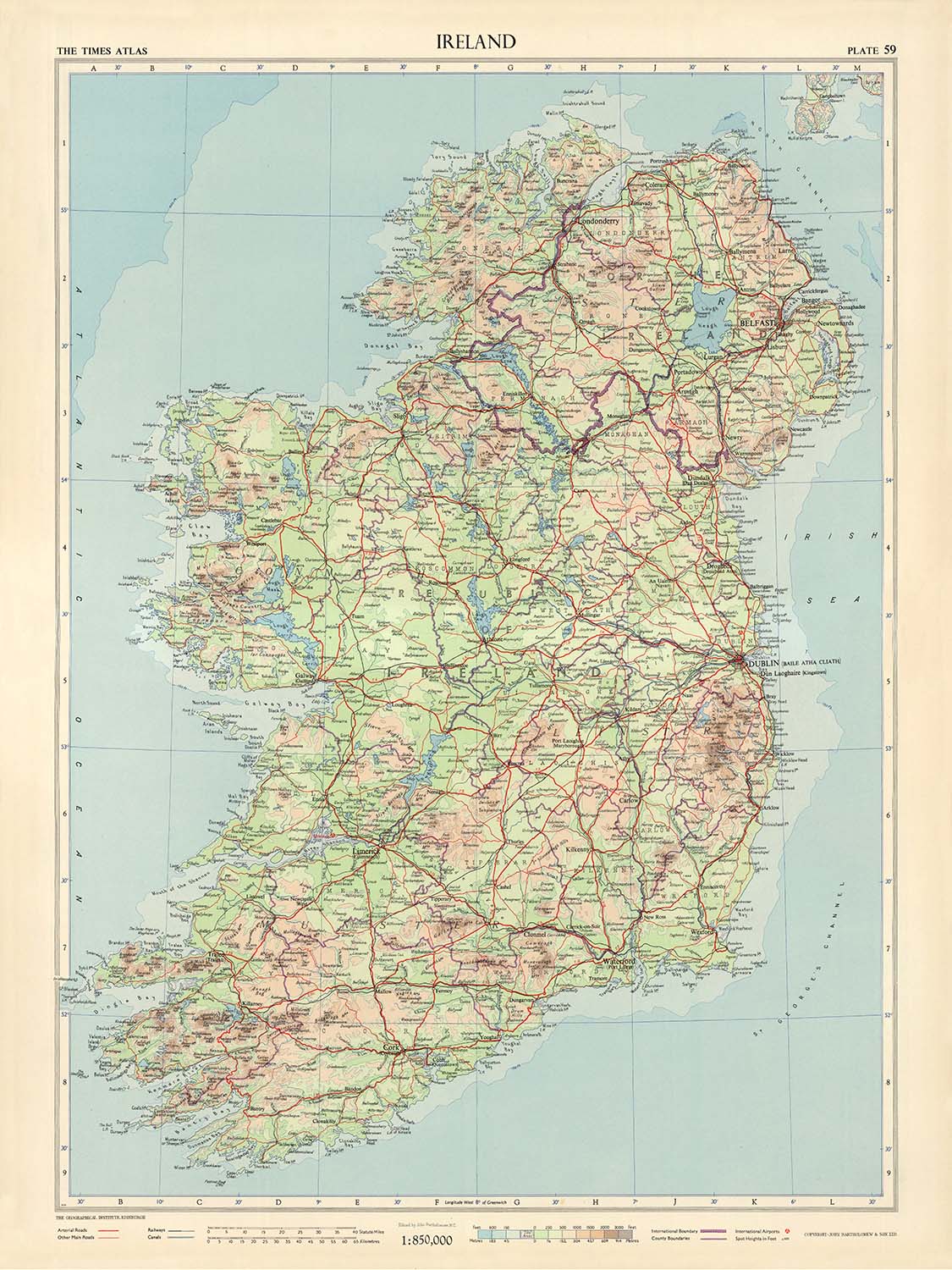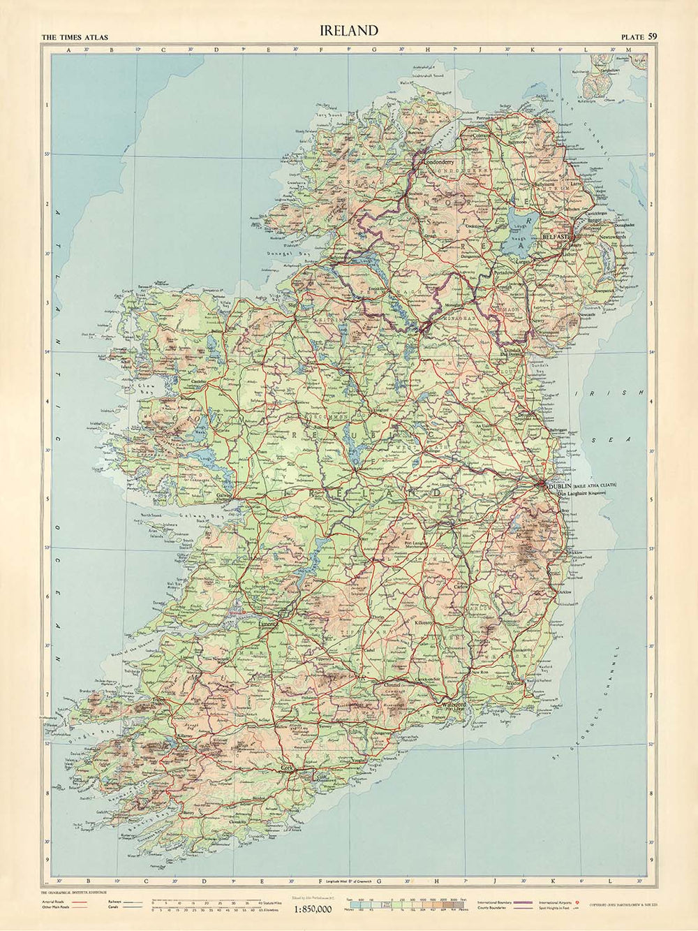 The Bartholomew name—synonymous with clarity, scientific rigor, and beautiful color—anchors this map in a distinguished Edinburgh tradition. By the 1950s, the firm had refined hypsometric coloring into a language of terrain, using delicate layer tints to reveal structure without overwhelming the eye. Under John (Ian) Bartholomew’s stewardship, lettering styles, line weights, and palette were harmonized to achieve both legibility and elegance, a hallmark of The Times Atlas program. Here, that editorial discipline yields a balanced Ireland: political boundaries readable at a glance, physical landforms articulated with quiet authority, and coastal soundings narrating the island’s maritime edge. The result feels as precise as a survey and as composed as a classic engraving.