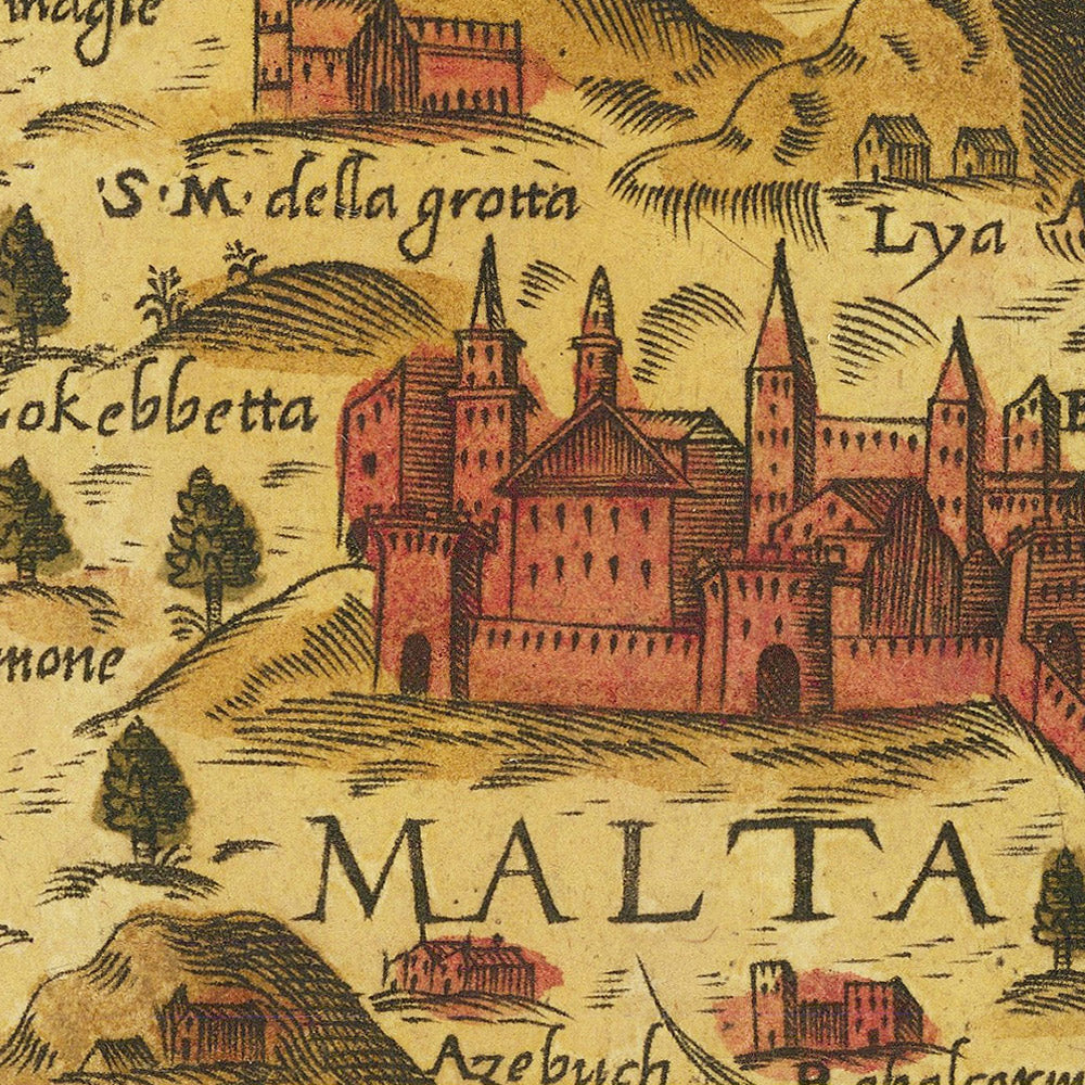 The toponymy offers a compelling palimpsest of languages and regimes. Bobakra resolves to modern Birkirkara; Dinagle anticipates Dingli; and Marsala maps to Marsaskala, each echoing the phonetics of an Italianate hand applied to Semitic and Latin roots. Paths and settlements thread the countryside, revealing the lived geography that fed and fortified the Order’s strongholds. Mdina’s prominence affirms its lingering administrative gravity, while the formidable presence of Fort Saint Angelo, commanding the northeastern reach of the harbor complex, signals the martial heart of the island before Valletta’s foundation. Camocio captures Malta at the pivot: an entrenched network of towns and bastions poised to be reforged by siege and subsequent urban ambition.