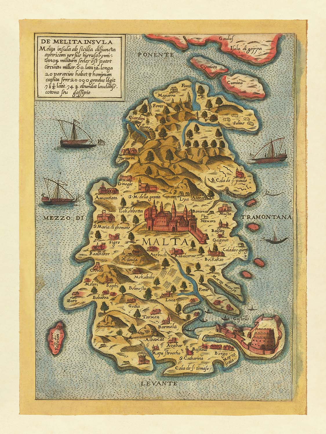Camocio frames the main island of Malta in commanding relief, with Camino (Comino) riding mid-channel and the near shore of Gozo—its capital Rabat (now Victoria)—visible across the strait. High hills and incised valleys articulate the spine of Malta, culminating at dignified Mdina, the island’s former capital, perched above the fertile central plain. The eastern littoral is a choreography of harbors and promontories: Birgu and Senglea straddle the Grand Harbour, while the headland opposite Sliema hints at the future site of Valletta. Northward, Mellieħa anchors the approaches to St. Paul’s Bay, and the winding coves toward Marsala (modern Marsaskala) register the island’s scalloped coast. Around them, lively galleys animate the surrounding seas.