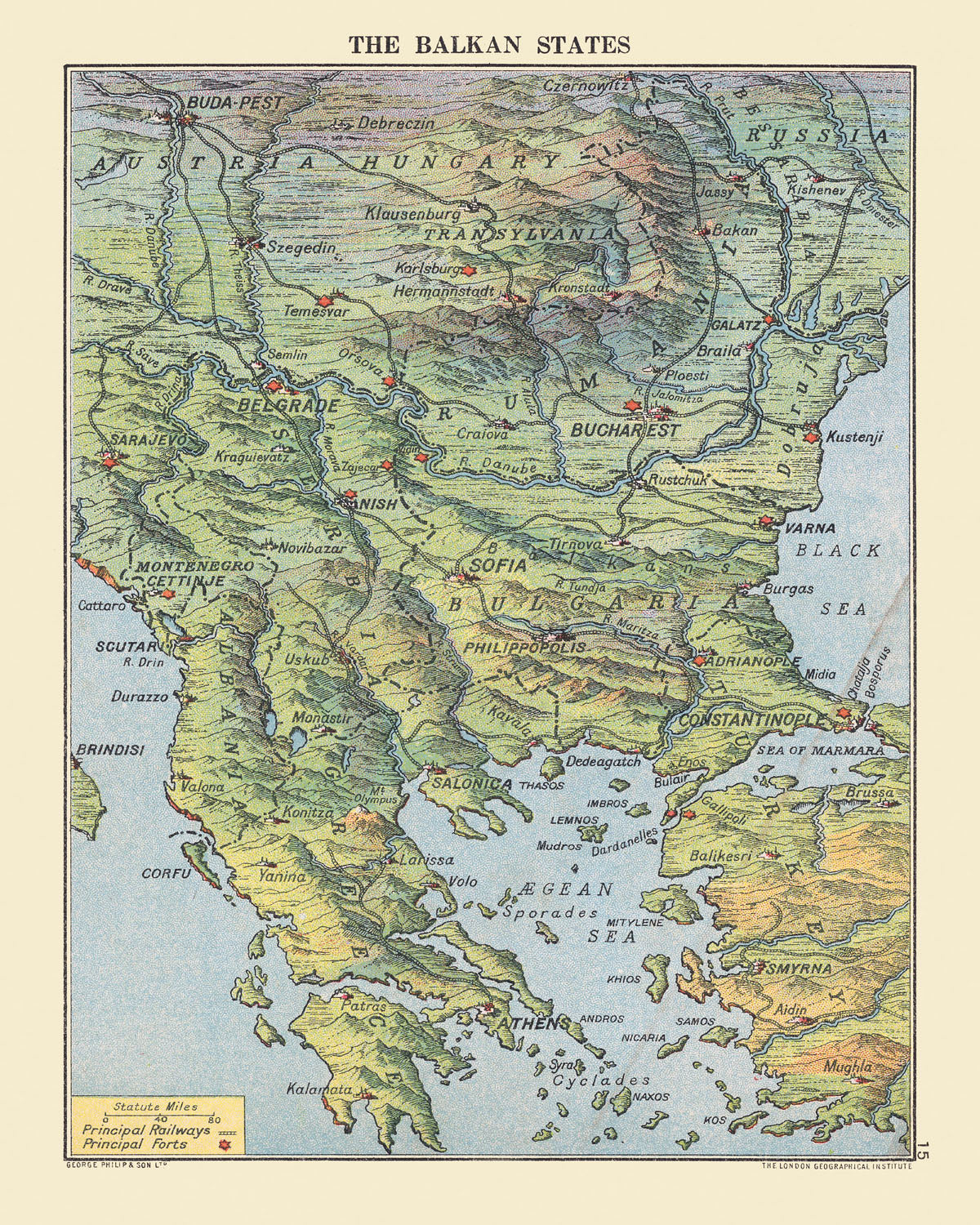 Created in 1916 by The London Geographical Institute, The Balkan States offers a masterful portrait of a region at the nexus of empires and national awakenings. Its vivid topography elevates mountains, river valleys, and coastlines into a coherent geometry of power and passage, while ornate lettering and careful symbology distinguish capitals and strategic towns. Political borders are crisply articulated against the physical landscape, inviting the viewer to read how terrain shaped diplomacy and ambition. Seen through this lens, the Balkans emerge not as a periphery but as the hinge of Europe—where the Danube converges with the Aegean and Adriatic, and where the nomenclature of cities—Athens, Belgrade, Sofia, Bucharest, and Constantinople—evokes centuries of shifting sovereignties.