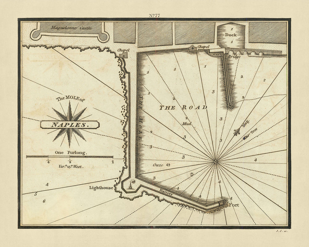 For collectors, historians, and enthusiasts of maritime history, owning the "Mole of Naples" map is a unique opportunity. Its rarity is underscored by its exceptional condition and the fact that examples of this specific chart are seldom seen on the market today. As a piece that beautifully marries historical significance with artistic elegance, it represents not only a pivotal moment in Mediterranean navigation but also serves as a lasting legacy of Naples' storied past, preserved through the meticulous efforts of William Heather and John Stephenson.
