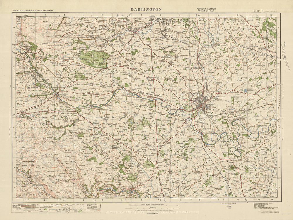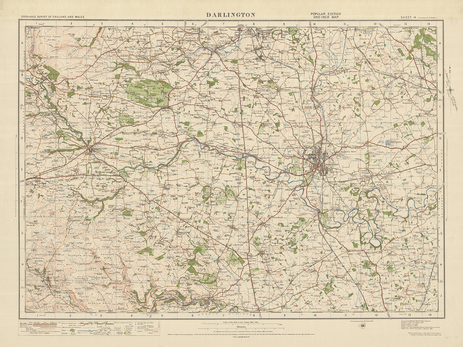 This old map, titled "Sheet 14 - Darlington," is a remarkable piece from Ordnance Survey's One-inch "Popular" edition, England and Wales, published in 1925. The map showcases the historic county of Darlington, providing a fascinating glimpse into the past. It includes several towns, cities, and interesting features, such as Newton Aycliffe, Shildon, Richmond, Barnard Castle, and St Helen Auckland.