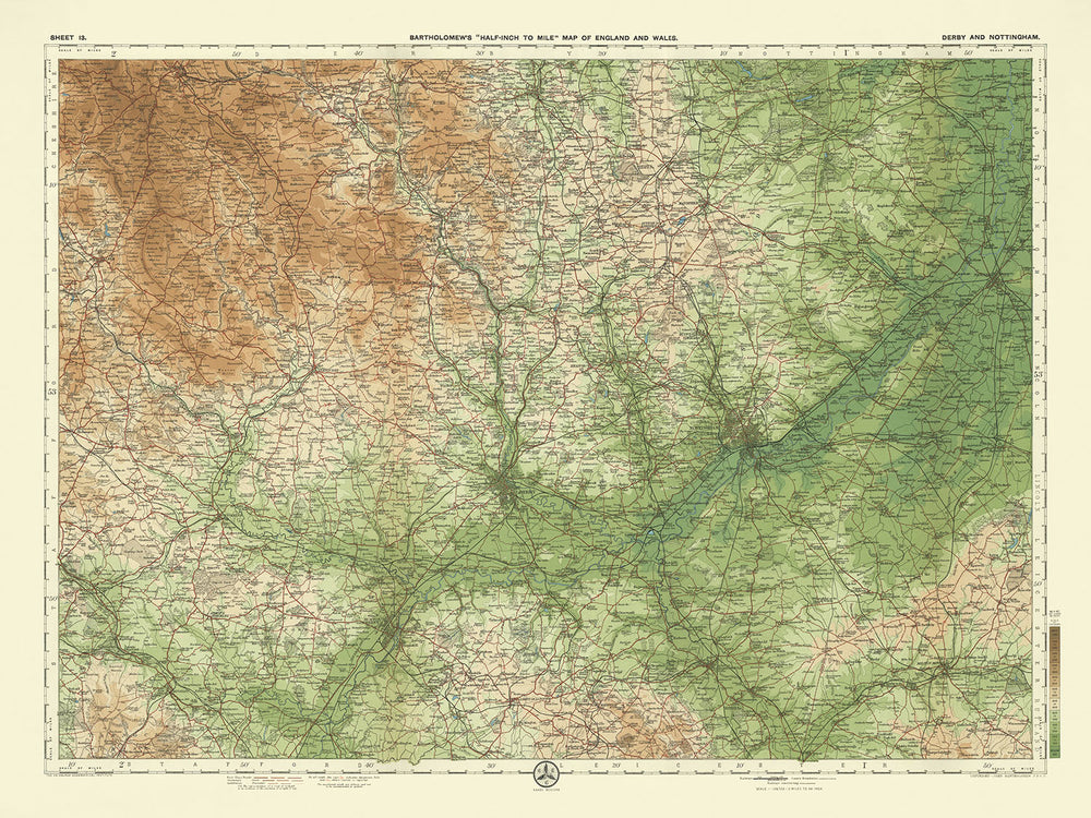 Sheet 13 - Derby & Nottingham, crafted by the esteemed cartographer J.G. Bartholomew in 1901, is a masterful representation of early 20th-century cartography. Known as "the Prince of Cartographers," Bartholomew's work is celebrated for its precision and aesthetic appeal. This map, part of Bartholomew's flagship half-inch to the mile series, offers a detailed political and physical portrayal of Derbyshire and Nottinghamshire. Its meticulous design, with layered colors to depict landscape relief, showcases Bartholomew's innovative approach to cartography, making it a prized possession for collectors and history enthusiasts alike.
