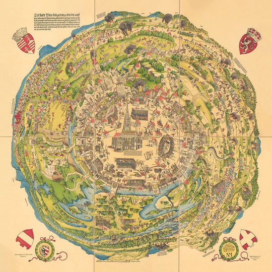 Step into the rich tapestry of history with Niklas Meldeman's masterful depiction of the First Turkish Siege of Vienna, a pivotal event in European history. Created in 1529 and published in Nuremberg in 1530, this circular panoramic map offers a unique and authentic representation of Vienna under siege. Meldeman's artistry prioritizes the significance of the depicted areas, providing a vivid and detailed illustration of the beleaguered city. At the heart of the map stands St. Stephen's Cathedral, symbolizing Vienna's resilience amidst the chaos.