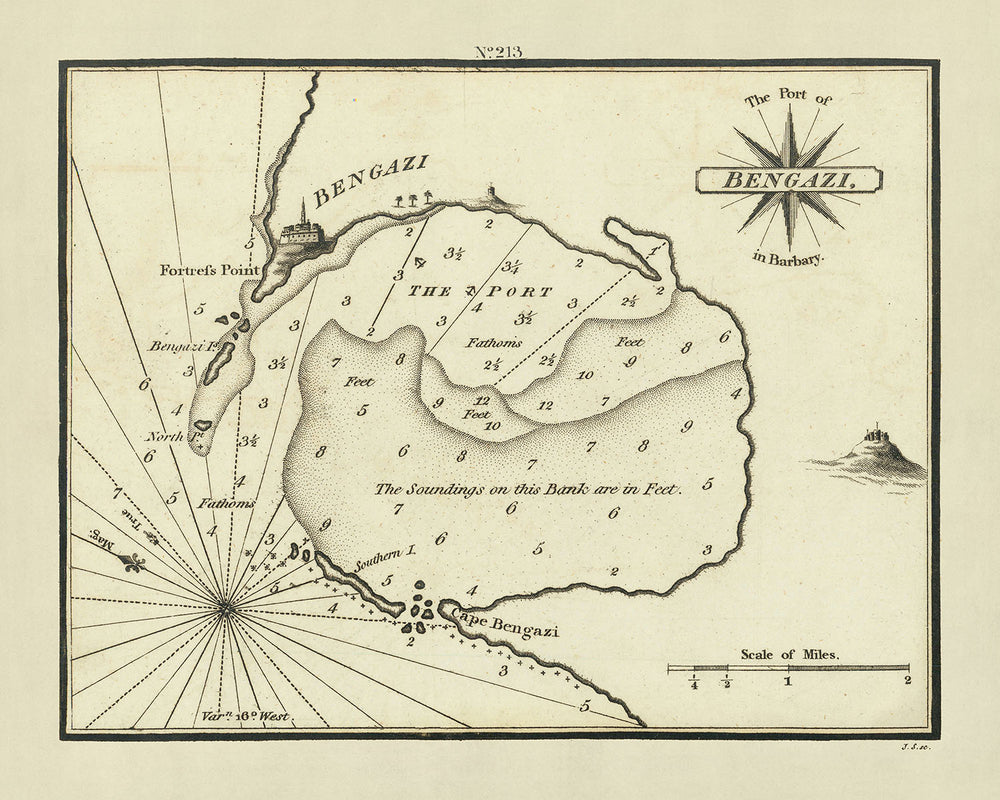 Old Port of Benghazi, Libya Nautical Chart by Heather, 1802: Fortres Point, Cape, Compass Rose