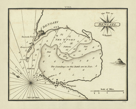 Centered on the bustling port of Benghazi, the map not only charts the immediate coastline but also extends to encompass the surrounding regions including the Gulf of Sidra and the city of Derna. Notable geographical markers such as Fortres Point, Cape Bengazi, and various small islands are clearly delineated. These features provide a glimpse into the strategic maritime and military significance of Benghazi during the early 19th century, a period marked by intense maritime activity and geopolitical maneuvering in the Mediterranean.
