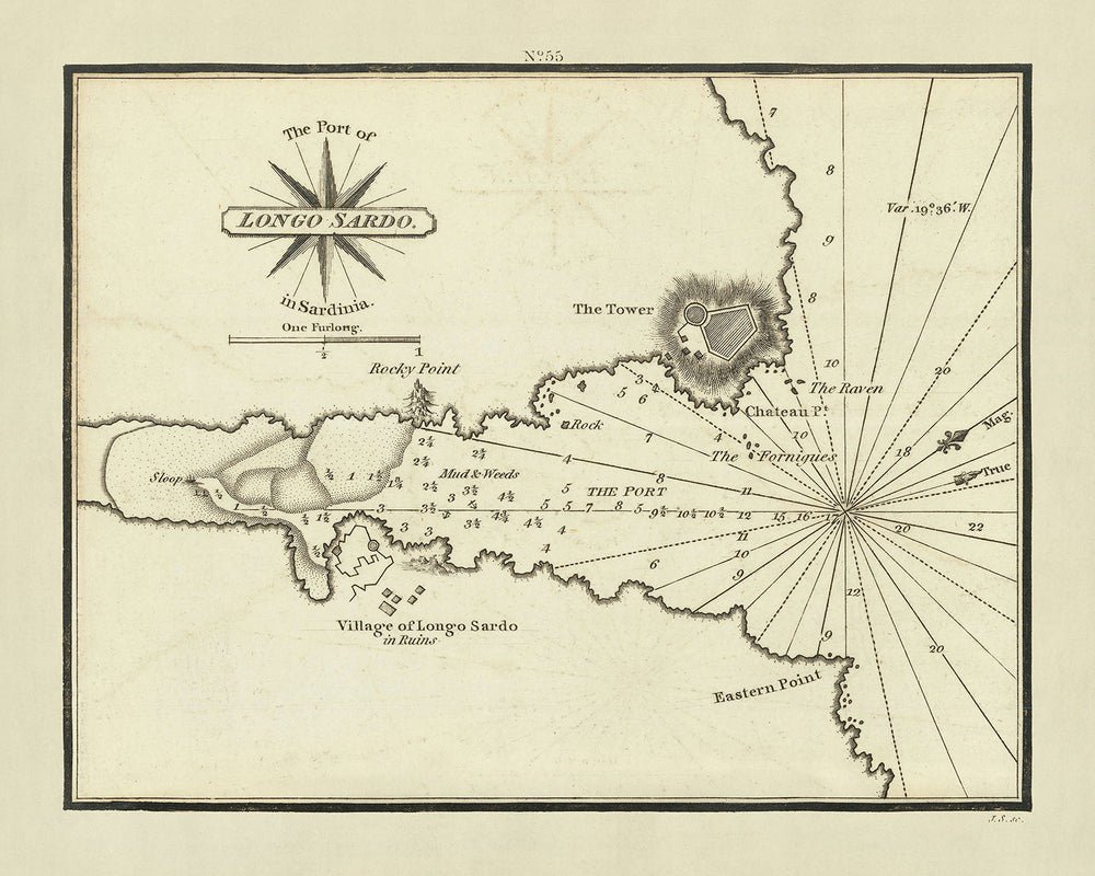 Beyond its navigational utility, the chart is a rich tapestry of the area’s topography and nautical specifics. It marks significant maritime and land features such as Rocky Point, Mud and Weeds, and The Fornigues. Notably, it also details the Village of Longo Sardo in ruins, providing a historical context to the region's past settlements. The Tower of Longo Sardo, another prominent feature, is likely a reference to a coastal watchtower, hinting at the region's historical defensive strategies against invaders or pirates.