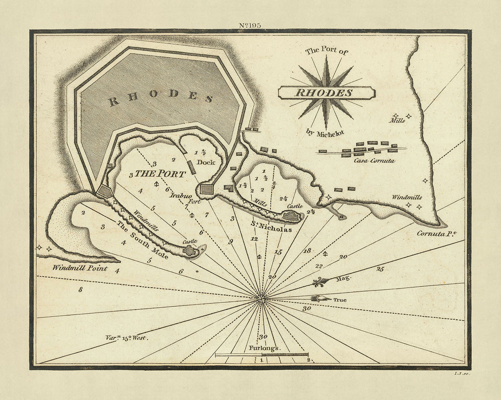 Old Port of Rhodes Nautical Chart by Heather, 1802: Soundings, Anchorages, Fortified City