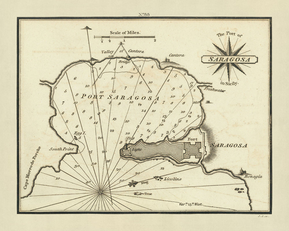 Heather's chart is a treasure trove of information for both mariners and historians. It features precise soundings in fathoms, crucial for understanding the depths and underwater terrain of the harbor. The inclusion of a compass rose and detailed water channels aids in navigating the complex coastal waters of Sicily. Noteworthy geographical landmarks such as the Valley of Cantera and the Licoline River are elegantly engraved, highlighting Heather's attention to both the natural and man-made environment. The chart also details Fort Saragosa and the iconic lighthouse, pivotal for the defense and maritime guidance of the era.