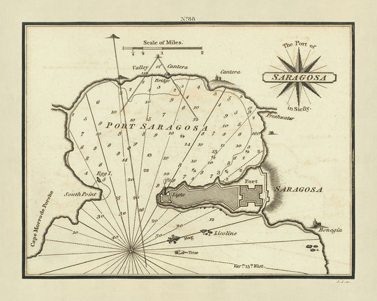 This chart of "The Port of Saragosa in Sicily" by William Heather is more than just a navigational aid; it is a portal to the past, inviting us to explore the rich maritime history and cartographic heritage of the Mediterranean.