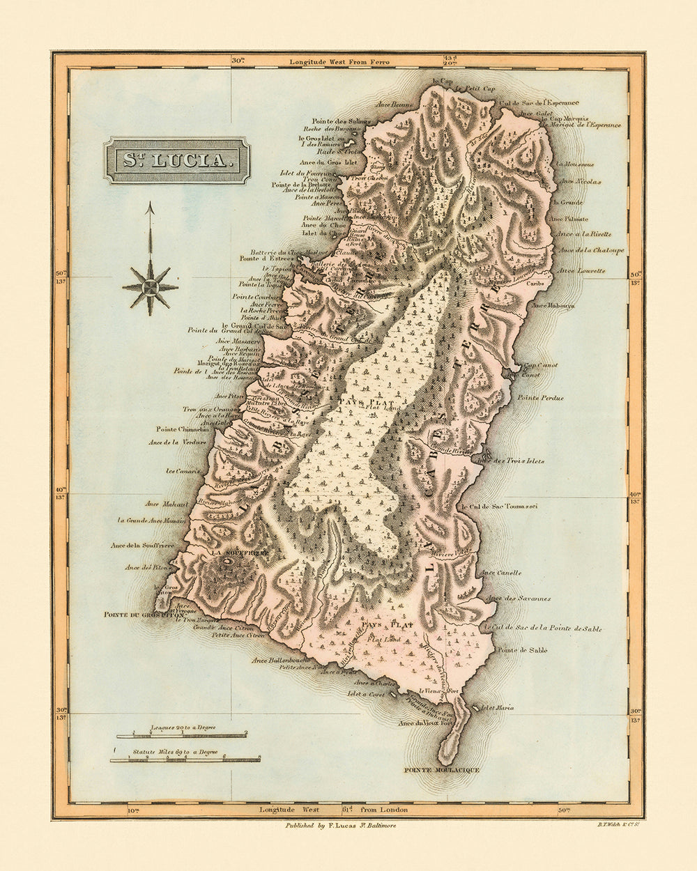 Introducing the exquisite "St. Lucia" map, meticulously crafted by the renowned American cartographer Fielding Lucas Jr. in 1823. This map, a rare gem from Lucas's General Atlas and A New General Atlas of the West India Islands, represents the first detailed commercial map of St. Lucia published in America. Lucas, celebrated for his precision and artistic flair, has rendered the island with an unparalleled level of detail, capturing its topography and coastal features with remarkable accuracy. This map is not just a navigational tool but a piece of art that offers a window into the early 19th-century cartographic knowledge and techniques.