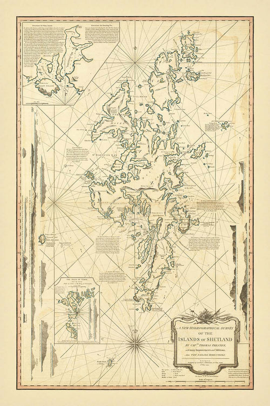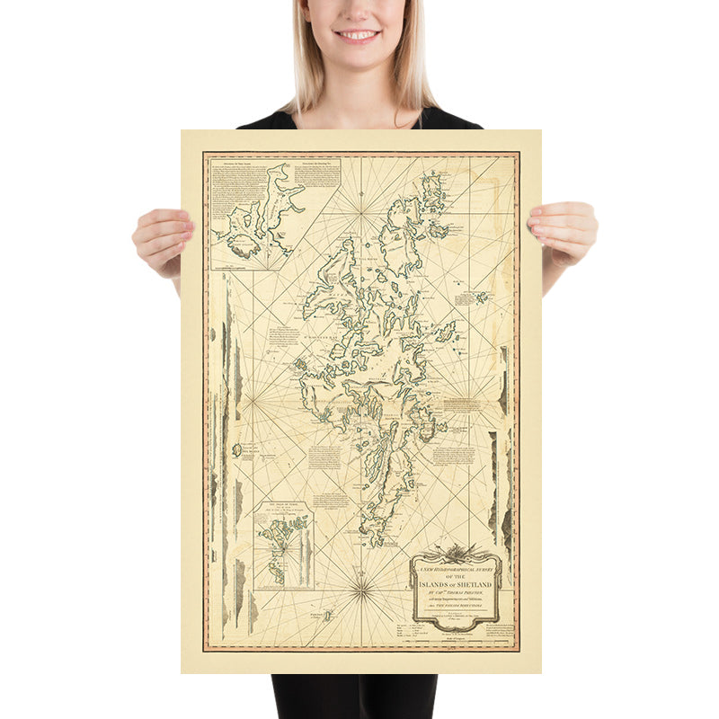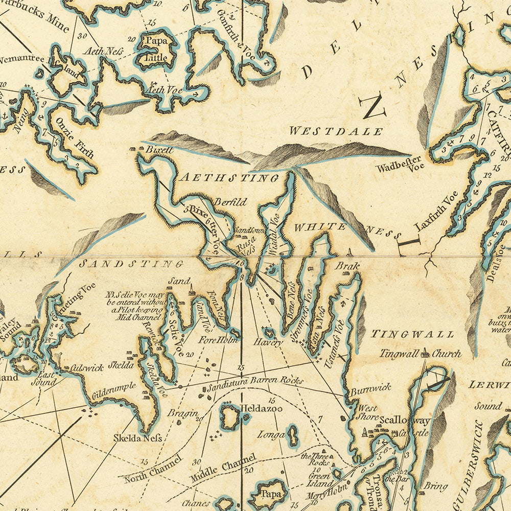 • Historical Significance: This map is significant for maritime navigation in the era, helping sailors safely navigate the treacherous coastal waters of the Shetland Islands.