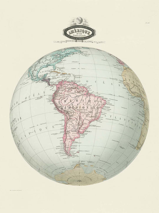 Old Spherical Map of South America by Garnier, 1860