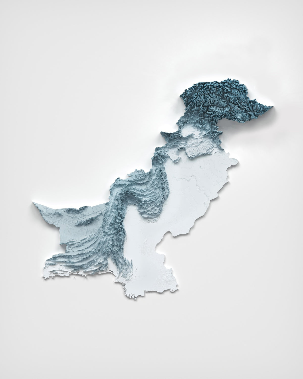 Finally, the land meets the sea along a low coastal plain broken by headlands and the branching fingers of the Indus delta. Here the relief falls to its gentlest expression — tidal flats, estuarine channels, and coastal terraces — yet even these subtle forms reveal themselves where light skims across them. From the high glaciers to the delta’s braided waterways, this piece captures the country’s full topographic story.