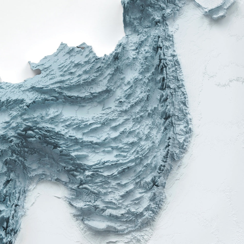 Our shaded relief prints use ultra high resolution topographic data and a secret 3D rendering process to create the illusion of raised terrain — like the mountains are about to lift right off the page. No labels, no borders, no distractions. Just the raw shape of the land, brought to life in a clean, modern style.